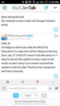 Asus đã thông báo rằng Android Wear 2.0 cho Asus ZenWatch 3 đã có và bây giờ là việc các bản tải nó về và cài đặt cho đồng hồ thông minh của mình. Nhưng đáng chú ý là bản cập nhật sẽ mất từ 5 đến 7 ngày do độ chậm trễ khác nhau đôi chút ở từng quốc gia. Do vậy bàn đừng quá lo lắng nếu chưa thấy bản cập nhật. Bản cập nhật đã chính thức được bắt đầu tung ra vào ngày 12 tháng 7 và đồng hồ thông minh ZenWatch 3 sẽ được cập nhật đầy đủ theo như thông báo chính thức từ Asus.