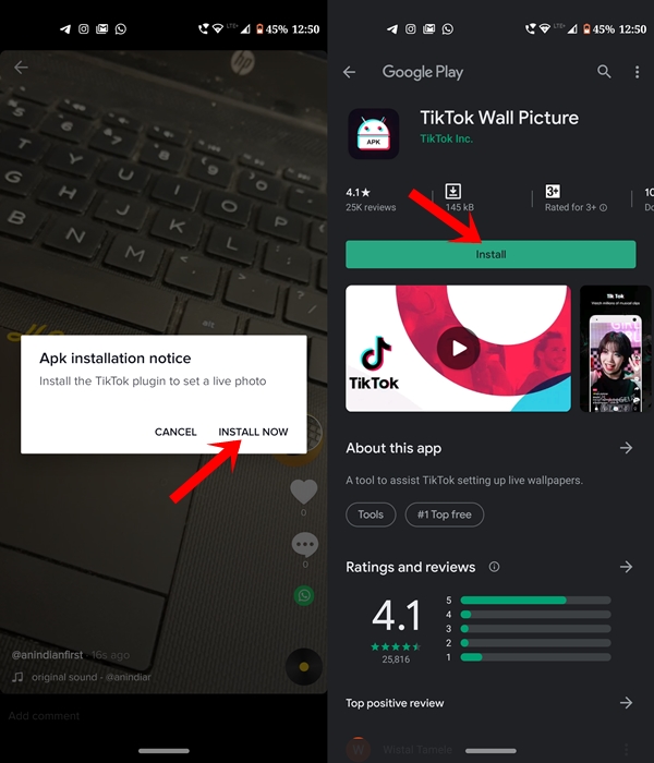 Để thực hiện các bước trên, bạn sẽ phải tải xuống một plugin TikTok bổ sung từ Play Store. Vì vậy, hoặc làm điều đó ngay từ đầu, hoặc bạn cũng có thể làm tương tự ở giữa các bước, và khi TikTok thông báo. Như đã nói, đây là hướng dẫn để chuyển đổi video TikTok thành hình nền sống .