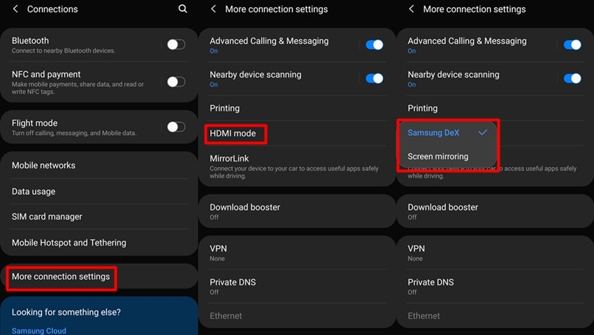 Thực hiện theo các bước sau để thay đổi chế độ HDMI trên thiết bị Samsung. Cũng đáng lưu ý rằng bạn sẽ phải chuyển đổi thủ công chế độ HDMI trong trường hợp bạn muốn sử dụng Samsung DeX hoặc ngược lại. Samsung DeX được hỗ trợ trên các thiết bị sau hiện tại – dòng Galaxy S8, dòng Galaxy S9, dòng Galaxy S10, dòng Galaxy Note 8, dòng Galaxy Note 9 và dòng Galaxy Note 10.