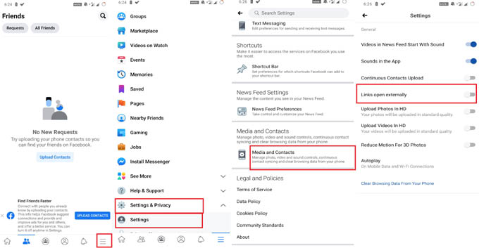 Bây giờ, hãy chuyển sang ứng dụng phổ biến Facebook. Dưới đây là các bước bạn có thể sử dụng để tắt trình duyệt trong ứng dụng Facebook.