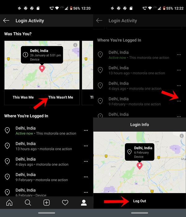 6. Nếu bạn đánh hơi bất cứ điều gì đáng ngờ, tốt hơn là xóa thiết bị được kết nối đó khỏi Instagram. Để làm như vậy, chỉ cần nhấn vào Đăng xuất bên dưới vị trí.