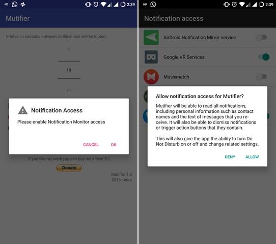 2. Vào lần khởi chạy đầu tiên, ứng dụng Mutifier sẽ yêu cầu “Truy cập thông báo.” Bấm vào OK  và bạn sẽ trực tiếp vào menu thông báo. Nhấn nút chuyển đổi bên cạnh ứng dụng Mutifier và nhấn vào “Cho phép”.