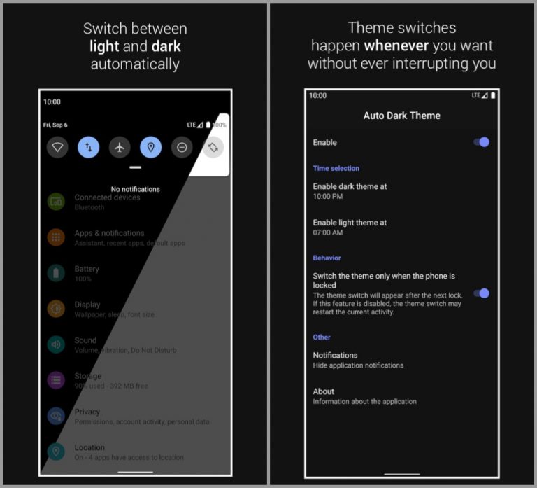 Ngoài ra còn có chức năng chuyển đổi chủ đề chỉ khi điện thoại bị khóa. Điều này có vẻ như là một lựa chọn tinh tế để bao gồm nhưng nó không phải là. Hệ thống chuyển sang một chủ đề tối trong khi bạn đang sử dụng một ứng dụng sẽ dẫn đến việc ứng dụng bị sập hoặc khởi động lại. Chắc chắn không tuyệt vời cho trải nghiệm người dùng. Ứng dụng khắc phục điều này bằng cách đơn giản thực hiện trong khi thiết bị bị khóa, tức là không sử dụng. Phương pháp của Google là rút lại tính năng hoàn toàn sau khi thử nghiệm bản beta.