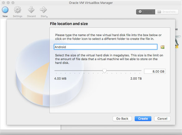 9. Nhấp Contineu. Trên màn hình kế tiếp (ở trên), bạn có thể chọn một vị trí trên đĩa cứng của bạn để lưu trữ đĩa cứng ảo của bạn, nó sẽ được sử dụng làm bộ nhớ trong cho máy ảo Android của bạn. Thay đổi kích thước của đĩa ảo nếu bạn muốn, nhưng giá trị mặc định là đủ tốt.