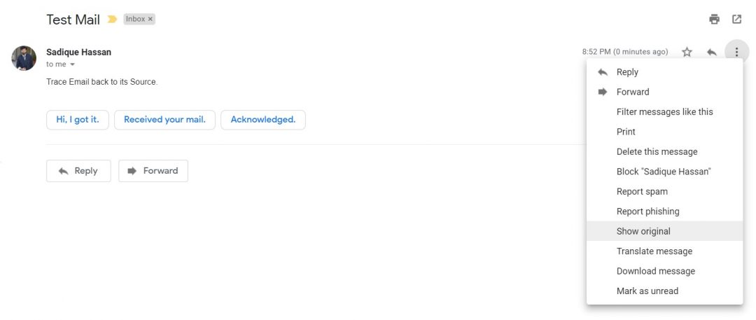 3. Bây giờ bạn sẽ phải xem thư gốc của Bỉ, tức là thư có tất cả các thông tin ẩn. Các trình duyệt khác nhau có các phương pháp khác nhau để truy cập tùy chọn này. Trong hướng dẫn này, chúng tôi đã sử dụng trình duyệt Chrome để theo dõi email trở lại nguồn của nó. Bạn có thể thử điều này với bất kỳ ứng dụng email nào có khả năng để hiển thị email gốc. Đây là cách bạn có thể truy cập tùy chọn này trong các trình duyệt khác nhau:
