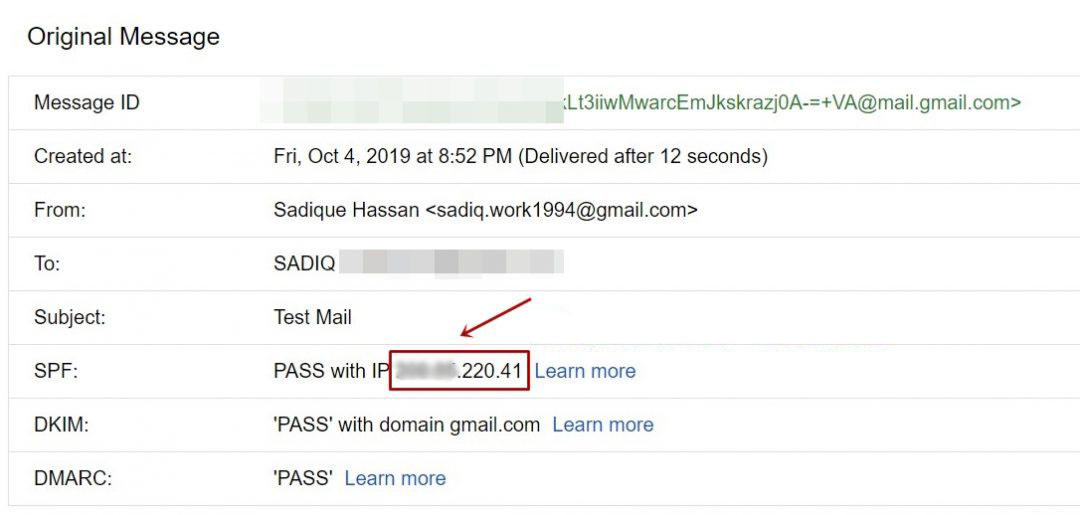 8. Ở đầu trang, bạn sẽ thấy một phần với ID tin nhắn, Được tạo tại, Từ, v.v. Bạn cần tìm phần SPF . Đây là những gì Google nói về SPF :