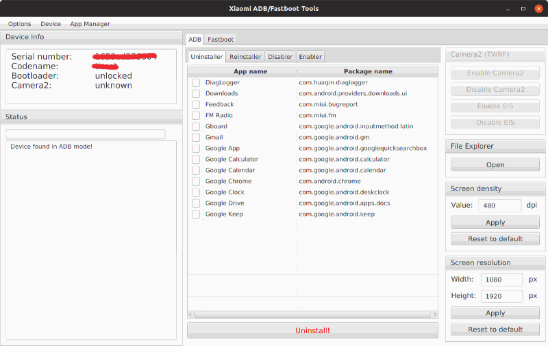 Bây giờ kết nối điện thoại thông minh Xiaomi của bạn với PC và tải phần mềm Xiaomi Debloater. Nó sẽ tự động phát hiện thiết bị của bạn và sẽ hiển thị cho bạn danh sách các ứng dụng có thể xóa dễ dàng.