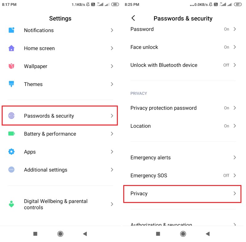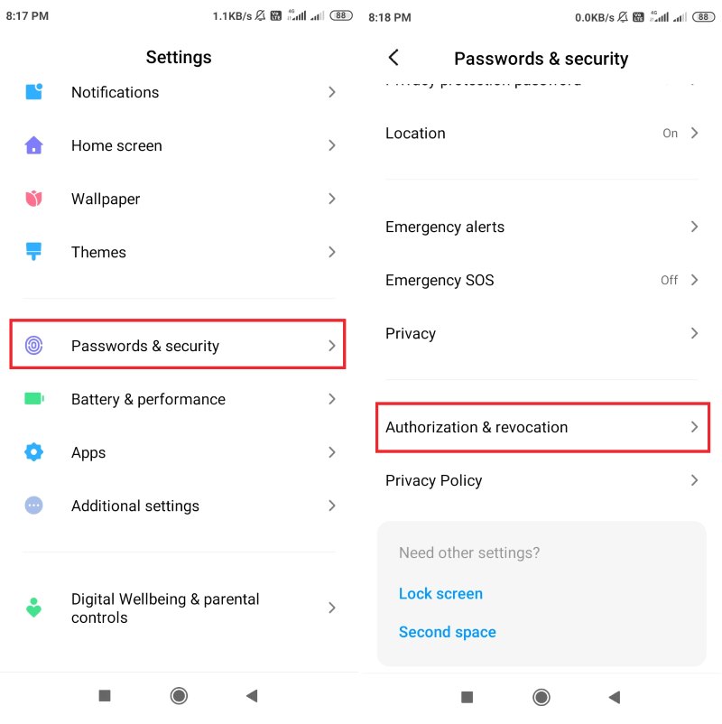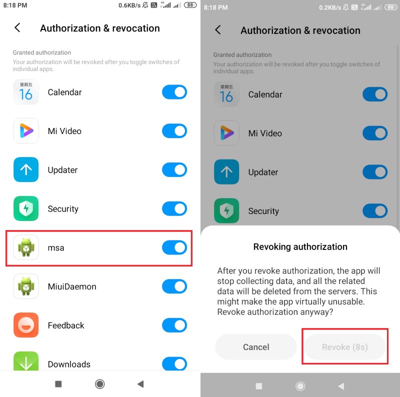 Điều hướng đến Cài đặt -> Mật khẩu và Bảo mật. Ở đây đi đến tùy chọn Ủy quyền và Thu hồi. Cuộn xuống và tìm chuyển đổi cho ứng dụng MSA. Hãy chắc chắn rằng nó bị vô hiệu hóa.