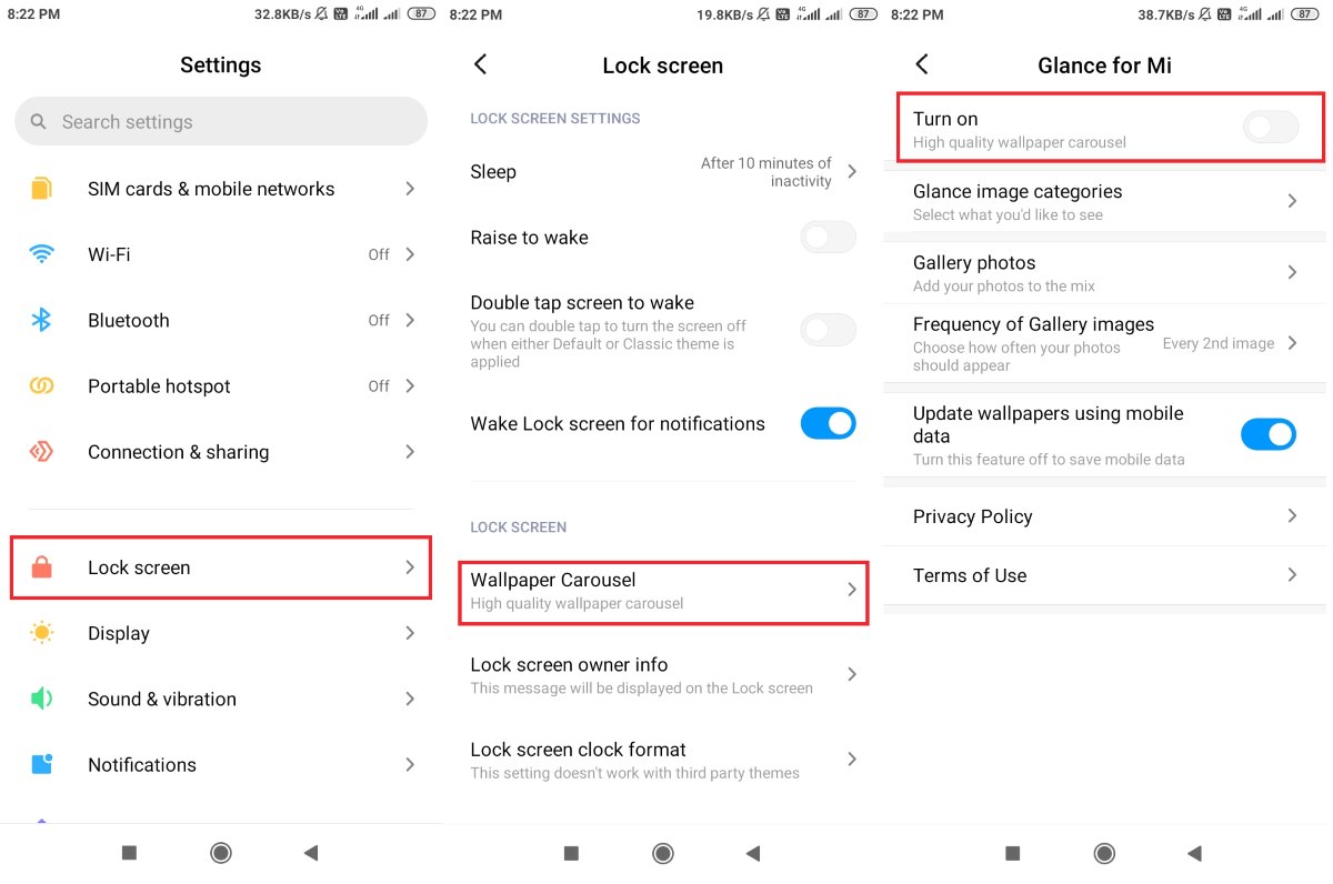 Bây giờ chúng tôi cần phải tắt quảng cáo Lockscreen. Đây là những quảng cáo mà bạn thường thấy trên màn hình khóa, khóa hoặc mở khóa thiết bị của bạn. Để thực hiện việc này, Mở Cài đặt> Màn hình khóa -> Băng chuyền hình nền . Tại đây, vô hiệu hóa chuyển đổi cho Bật Bật hình nền Carousel, và bạn đã hoàn thành với quảng cáo màn hình khóa MIUI.