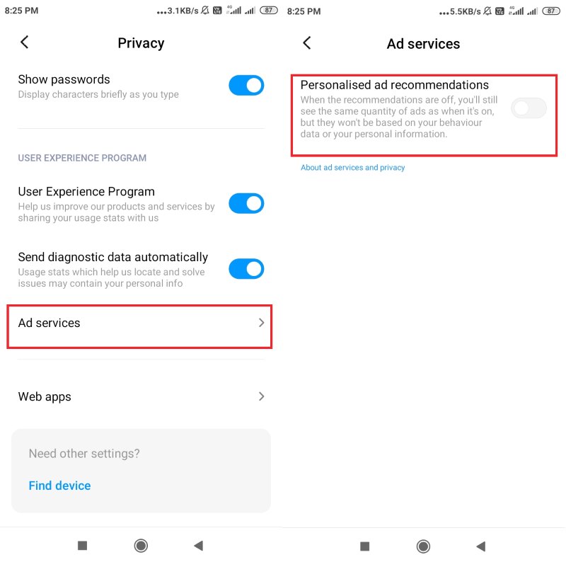 Tại đây cuộn xuống và tìm kiếm tùy chọn Dịch vụ Quảng cáo Quảng cáo. Chỉ cần vô hiệu hóa chuyển đổi và nó sẽ dừng tất cả các quảng cáo gây phiền nhiễu trên skin Android MIUI 11.