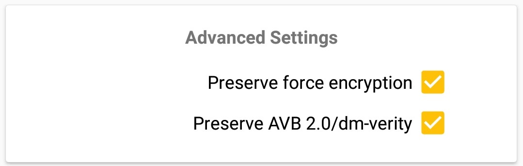 9. Trên màn hình chính Magisk, đánh dấu vào các ô bên cạnh Preserve force encryption và Preserve AVB 2.0/dm-verity