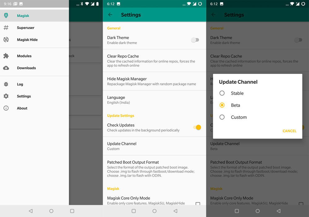 8. Đi tới Cài đặt Trình quản lý Magisk và nhấn vào Cập nhật kênh rồi thay đổi thành Beta .