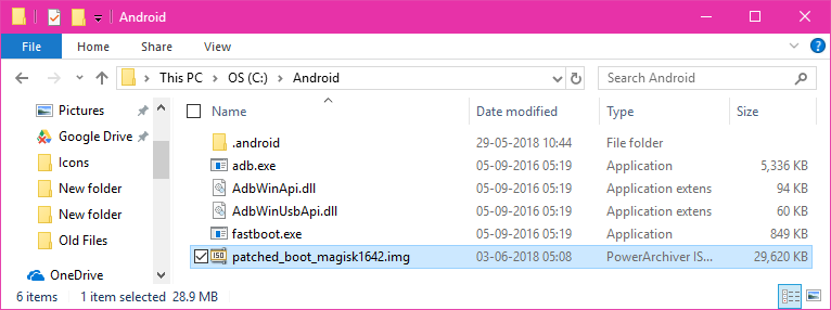 2. Tải xuống patched_boot_magisk1642.img cho OnePlus 6 chạy trên Hệ điều hành Oxygen 5.1.5. Chuyển tập tin cài đặt đã tải xuống này vào thư mục cài đặt ADB. Đây thường là thư mục platform-tools trong C: drive (C:\Android) hoặc thư mục Minimal ADB và Fastboot trong thư mục Program Files (x86) (C:\Program Files (x86)\Android) trừ khi bạn thay đổi nó trong suốt quá trình cài đặt (xem ảnh chụp màn hình bên dưới):