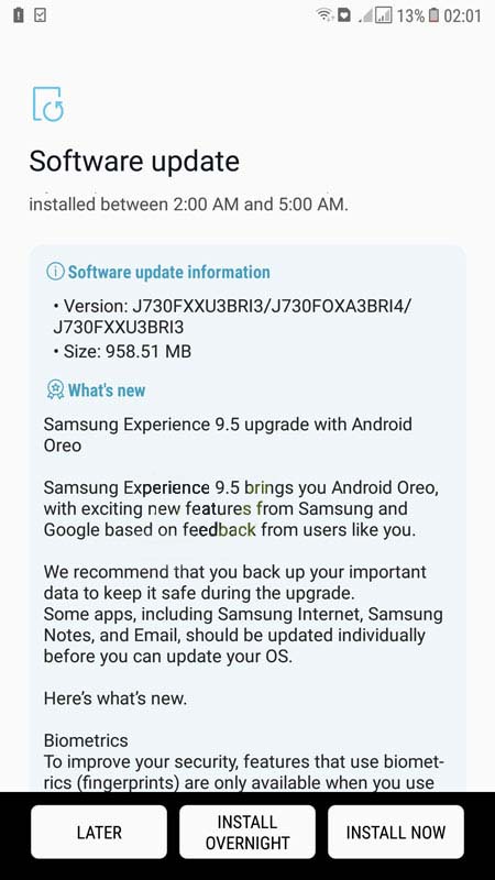 Nếu nó không có sẵn, bạn có thể tải xuống phần mềm Android 8.1 Oreo chính thức cho Galaxy J7 SM-J730F của bạn từ bên dưới và cài đặt nó trên điện thoại của bạn bằng cách làm theo hướng dẫn.